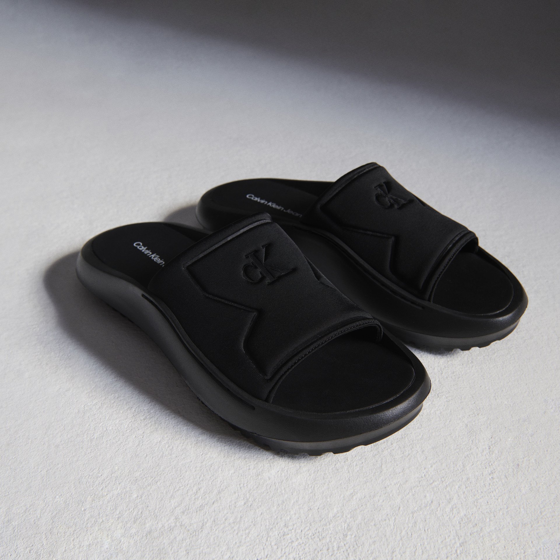 ブランドのモノグラムをあしらった100%リサイクルポリエステルのサンダルは、バギーなボトムスと合わせれば、エフォートレスなファッションに (写真のアイテムはメンズです)。